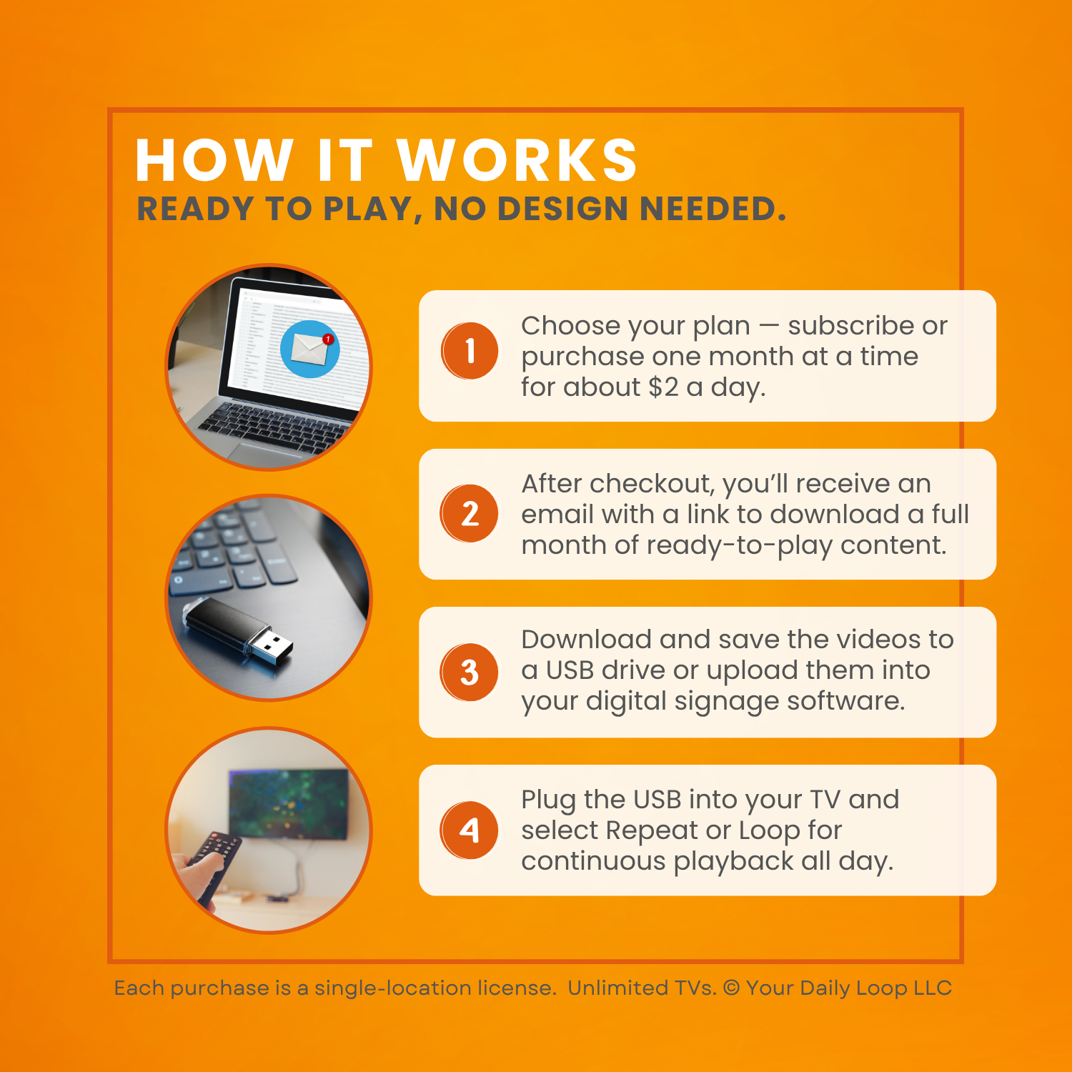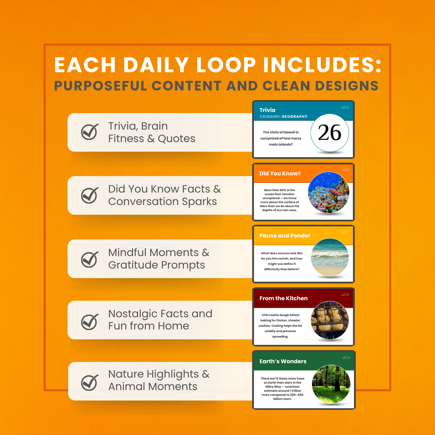 You’re receiving the complete set of daily loops for the current month, even if you purchase mid-month. That means you’ll still get all 30–31 dated loops — and because the content (aside from the “Today Is…” slide) is evergreen, you can repurpose earlier loops anytime for added engagement or conversation starters.